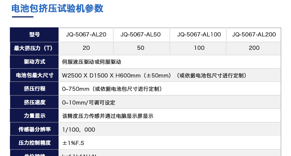 產(chǎn)品型號(hào):JQ-5067-AL20 品牌:劍 喬 用途:電池包擠壓試驗(yàn)機(jī)模擬各類動(dòng)力動(dòng)力電池包和系統(tǒng)在運(yùn)輸、儲(chǔ)存及使用過(guò)程中電池包遭受碰撞擠壓的情形,人工呈現(xiàn)電池在遭受擠壓時(shí)可能出現(xiàn)的不同狀況。咨詢熱線:13829135130