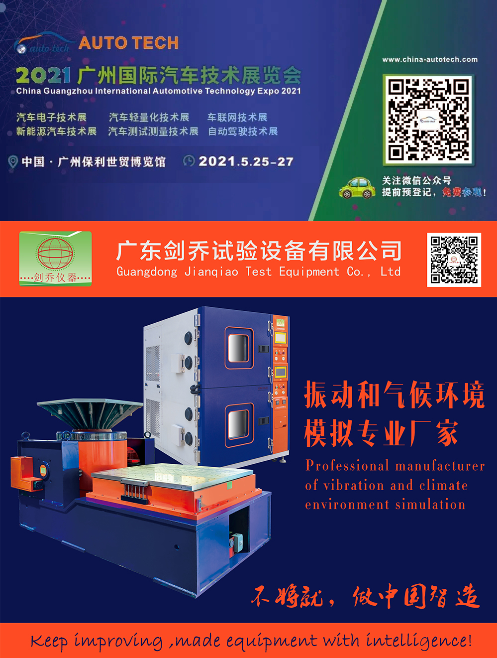 2021年5月25-27日,廣東劍喬試驗設(shè)備有限公司【劍喬儀器】將攜旗下最新試驗設(shè)備亮相AUTO TECH 2021 中國·廣州第八屆國際汽車技術(shù)展覽會,現(xiàn)場展示:振動試驗系統(tǒng)、溫濕度振動三綜合箱、高低溫防爆試驗箱高加速沖擊試驗臺、電池?zé)釣E用試驗機、電池短路試驗箱、等試驗設(shè)備及動力電池相關(guān)試驗解決方案。