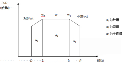 為了簡便起見,往往將功率譜密度曲線圖劃分成若干矩形和三角形,并利用上升斜率(如3dB/oct)和下降斜率(如-6dB/oct)分別算出wa 和w2,然后求各個幾何形狀的面積與面積和,再開方求出加速度總均方根值。