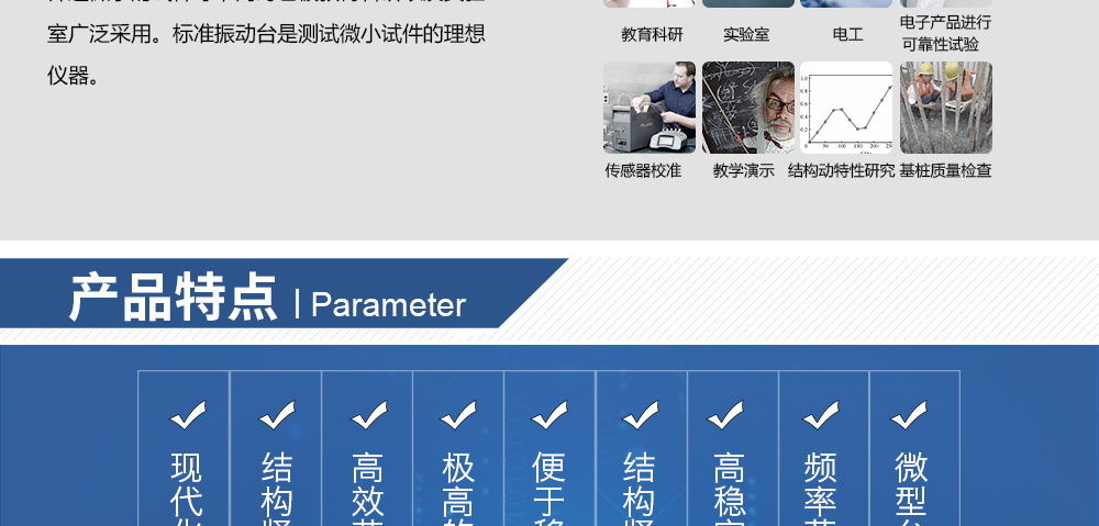 用途:小型標準振動臺具有很寬的可用頻帶,質量小便于移動,廣泛用于加速度傳感器的校準、分離和篩選微小的試件等,同時也被教育科研以及實驗室廣泛采用。